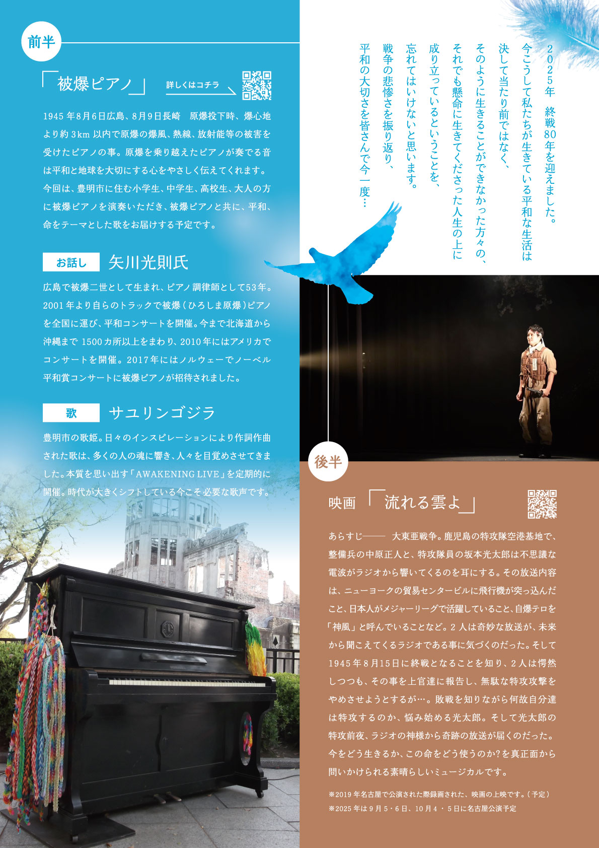 2025年に終戦80年を迎えました。戦争の悲惨さを振り返り、平和の大切さを今一度考える機会として被爆ピアノコンサート・「流れる雲よ」映画上映会を開催します。