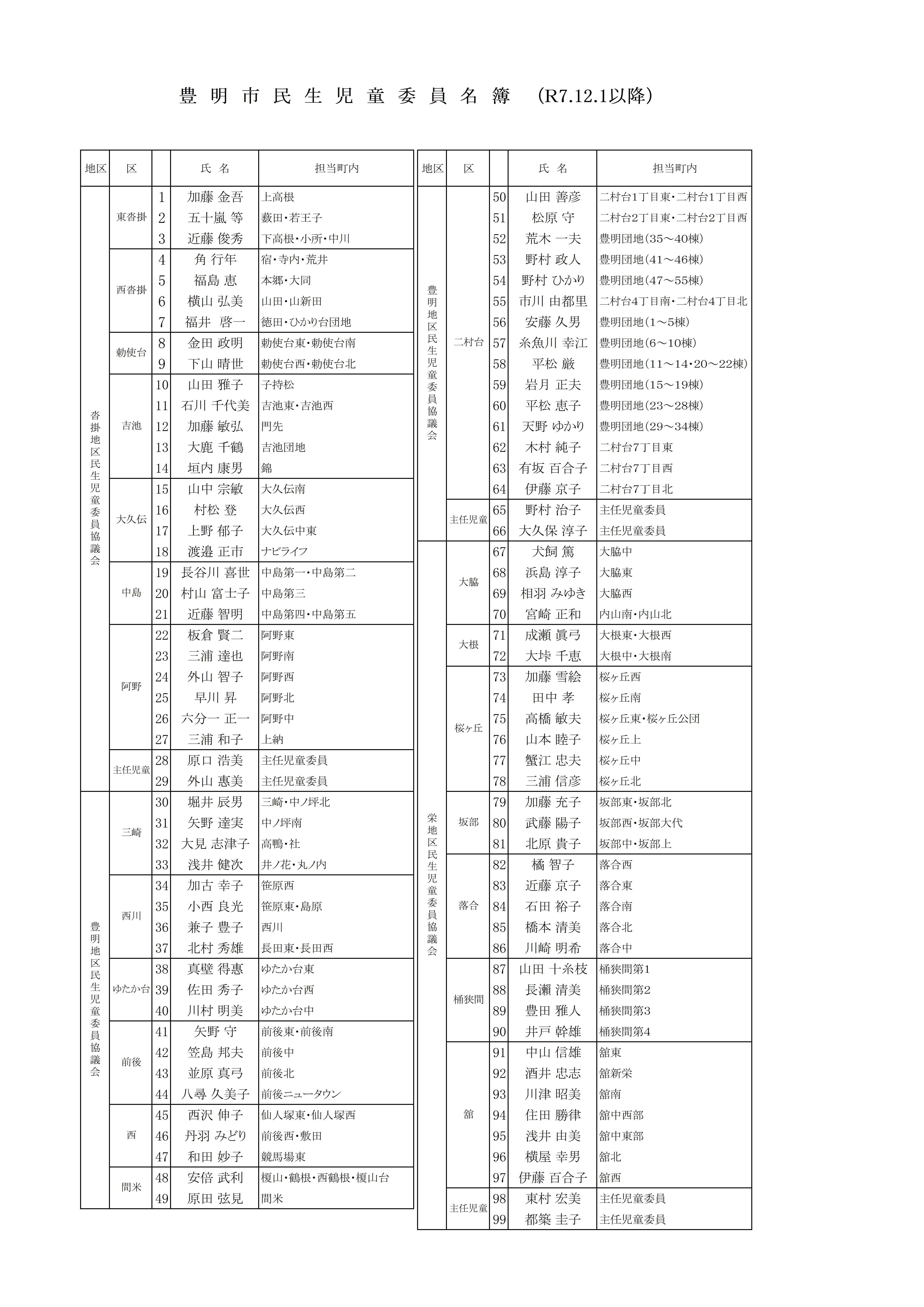 民生委員法で配置を定められており、豊明市では現在99名の方が民生児童委員として活動しています。(うち6名が児童専門の主任児童委員です)